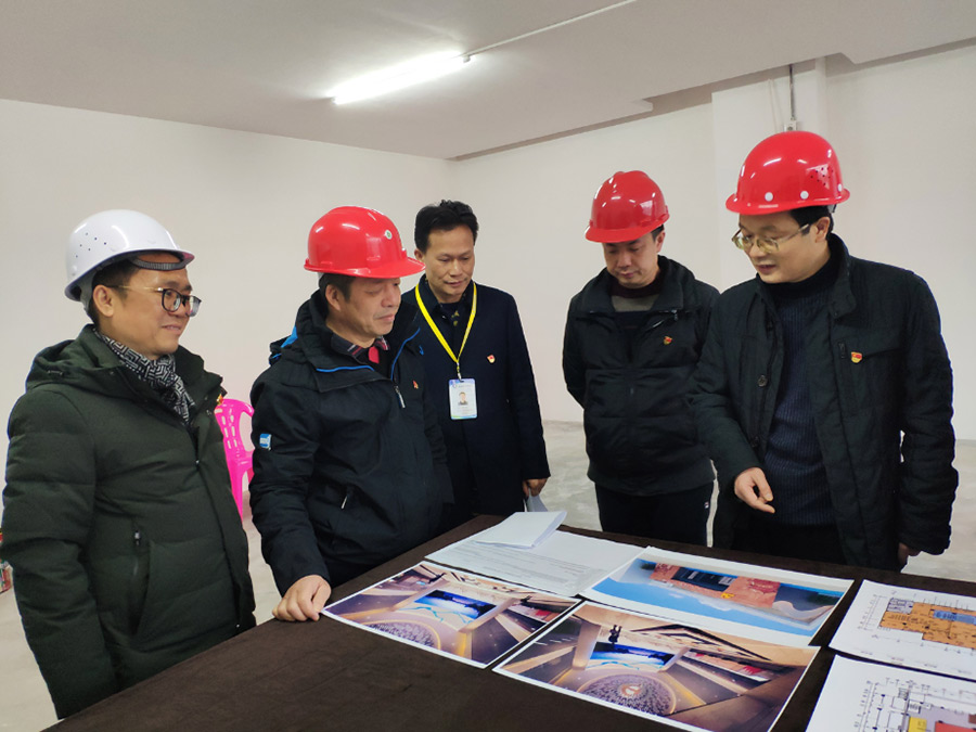 圖為周道林向工委領(lǐng)導(dǎo)介紹黨群服務(wù)中心設(shè)計效果圖相關(guān)情況