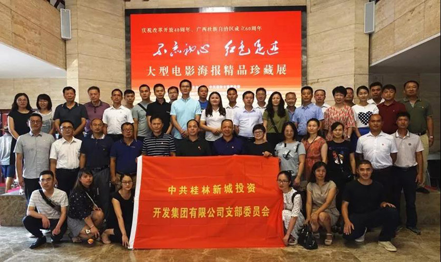 為深入學(xué)習(xí)貫徹落實(shí)習(xí)近平新時(shí)代中國(guó)特色社會(huì)主義思想和黨的十九大精神,慶祝改革開(kāi)放40周年、自治區(qū)成立60周年,2018年8月23日上午新城投資集團(tuán)黨支部組織全體黨員和中層副職以上干部參觀“不忘初心?紅色足跡”大型電影海報(bào)精品珍藏展。臨桂新區(qū)工委委員、臨桂新區(qū)管委會(huì)副主任覃正東,新城投資集團(tuán)黨支部書(shū)記周道林以普通黨員身份參加了此次活動(dòng)。