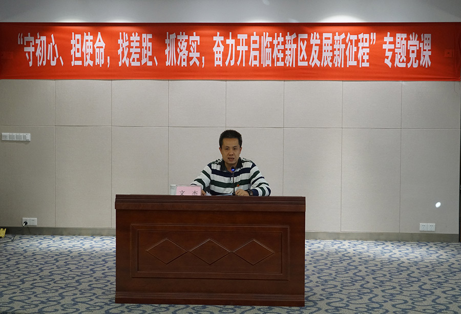 11月4日,按照主題教育安排部署,臨桂新區(qū)工委委員、管委會(huì)副主任文杰以“守初心、擔(dān)使命,找差距、抓落實(shí),奮力開啟臨桂新區(qū)發(fā)展新征程”為主題,為新城投資集團(tuán)全體黨員、積極分子、中層副職以上干部上了一堂專題黨課。