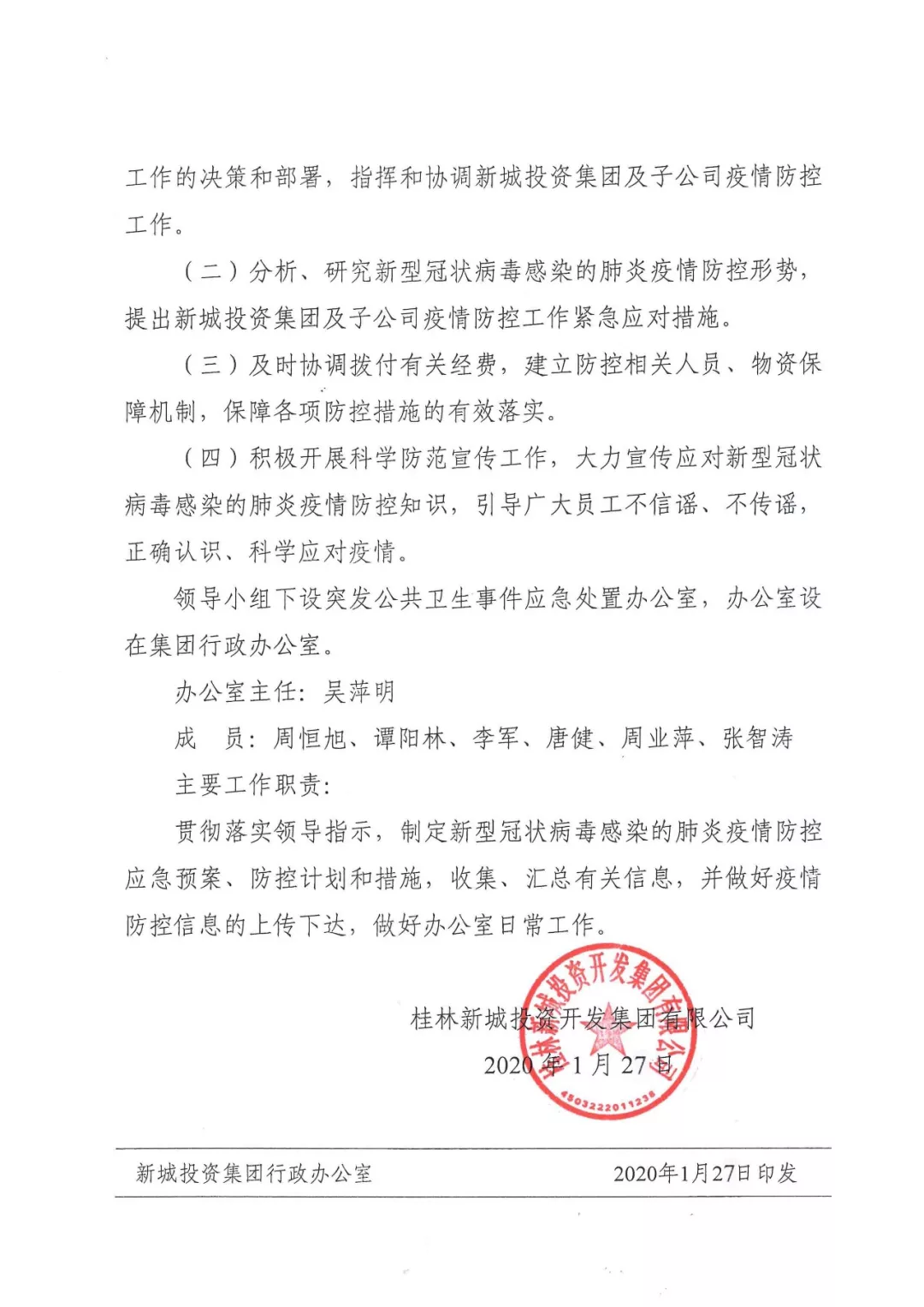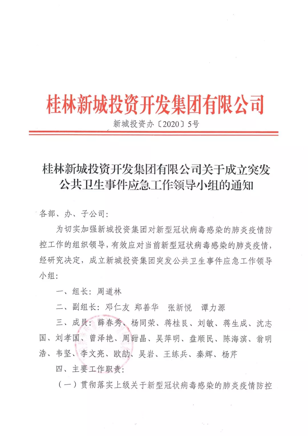 新城投資集團(tuán)上下立即行動起來,堅決貫徹落實(shí)黨中央的決策部署以及省、市委市政府相關(guān)要求,成立了突發(fā)公共衛(wèi)生事件應(yīng)急工作領(lǐng)導(dǎo)小組,統(tǒng)籌協(xié)調(diào)相關(guān)工作。集團(tuán)黨支部結(jié)合實(shí)際,組織全體職工特別是黨員采取切實(shí)有效措施開展防控,抓好疫情防控工作,堅決遏制疫情蔓延勢頭。