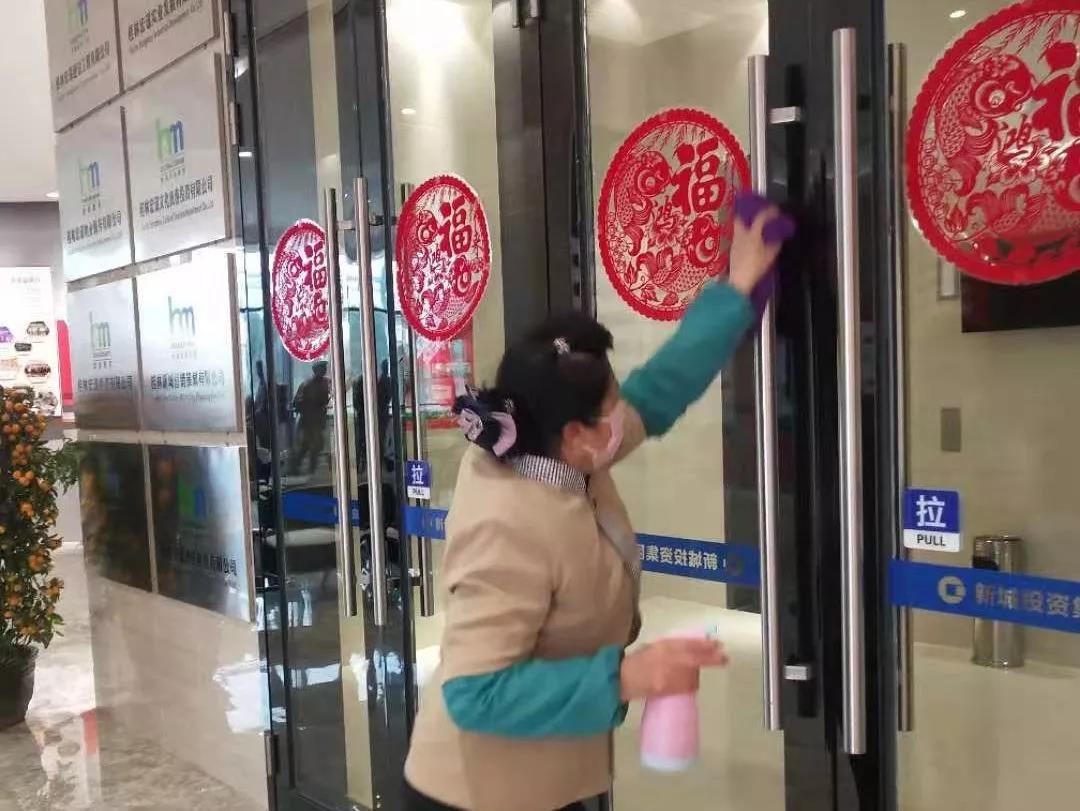 ▲新城投資集團(tuán)辦公樓項(xiàng)目對出入門廳、電梯、門把手、茶水間等位置進(jìn)行重點(diǎn)消毒。