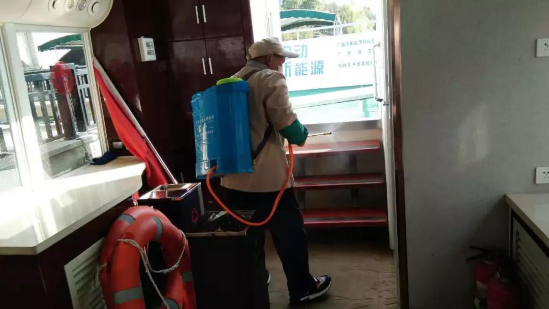 ▲游船項(xiàng)目對碼頭、游船內(nèi)部進(jìn)行消毒。