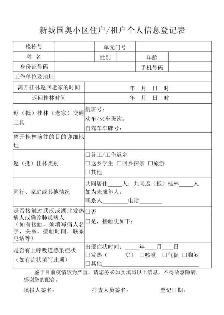 “您好!根據(jù)臨桂區(qū)疫情防控指揮部及新區(qū)管委會(huì)的要求,為切實(shí)做好疫情防控工作,杜絕在本小區(qū)內(nèi)發(fā)現(xiàn)疫情隱患,我們將對(duì)小區(qū)內(nèi)所有的住戶進(jìn)行逐一排查,請(qǐng)您配合我們填寫《新城國(guó)奧小區(qū)住戶/租戶個(gè)人信息登記表》。”