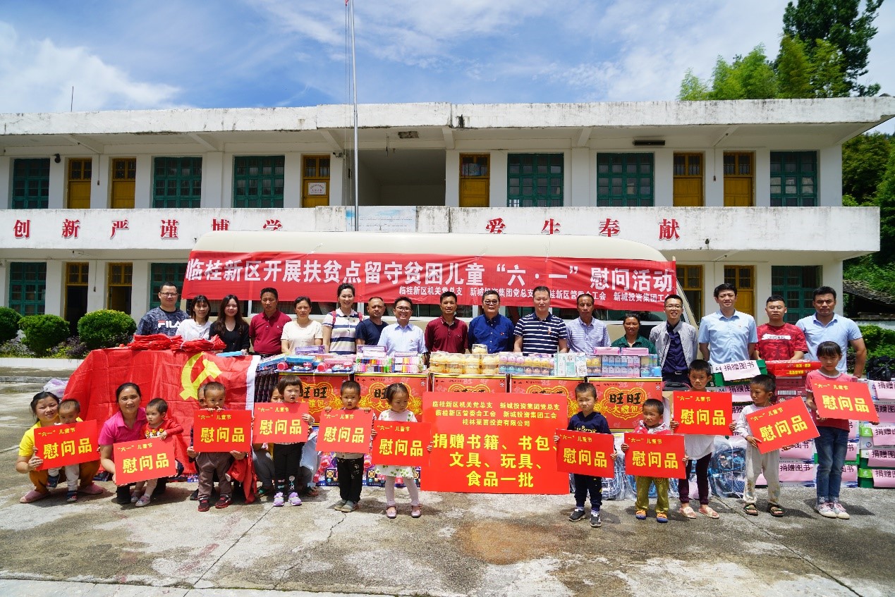 為關(guān)注扶貧村兒童的健康成長(zhǎng),讓他們過(guò)上快樂(lè)而有意義的“六一”兒童節(jié),6月1日,臨桂新區(qū)管委機(jī)關(guān)黨總支、新城投資集團(tuán)黨總支、臨桂新區(qū)管委會(huì)工會(huì)、新城投資集團(tuán)工會(huì)聯(lián)合組成慰問(wèn)組到資源縣兩水苗族鄉(xiāng)煙竹村扶貧點(diǎn)舉辦扶貧點(diǎn)留守貧困兒童“六?一”慰問(wèn)活動(dòng),給山區(qū)兒童送上節(jié)日祝福。