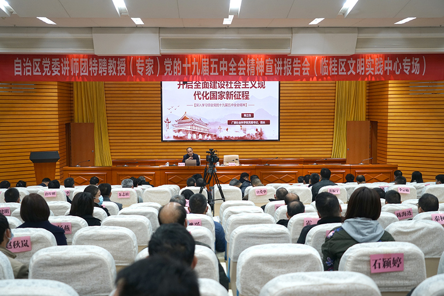 11月27日上午,自治區(qū)黨委講師團(tuán)黨的十九屆五中全會(huì)精神宣講報(bào)告會(huì)在臨桂新區(qū)工委會(huì)議室舉行。廣西社會(huì)科學(xué)院黨組書(shū)記、院長(zhǎng)陳立生作了題為“開(kāi)啟全面建設(shè)社會(huì)主義現(xiàn)代化國(guó)家新征程”宣講。臨桂新區(qū)工委第一副書(shū)記、管委會(huì)主任、臨桂區(qū)區(qū)委書(shū)記何新明主持報(bào)告會(huì),并作臨桂新區(qū)黨的十九屆五中全會(huì)精神學(xué)習(xí)動(dòng)員講話。