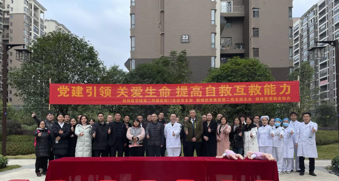 為全面貫徹中共桂林市委組織部關(guān)于深入推進黨支部工作聯(lián)系點建設示范帶動全市黨支部達標創(chuàng)優(yōu)的通知,推進黨支部工作聯(lián)系點建設,在臨桂新區(qū)工委掛點領(lǐng)導文杰和新城投資集團黨總支的指導下,新城投資集團黨總支部下轄第二黨支部聯(lián)合桂林醫(yī)學院第二附屬醫(yī)院門急診黨支部,于2020年12月8日在臨桂區(qū)桂醫(yī)熙境小區(qū)開展“黨建引領(lǐng),關(guān)愛生命、提高自救互救能力”主題黨日活動。此次活動分別組織了急救技能科普培訓、為社區(qū)居民義診兩項內(nèi)容。
