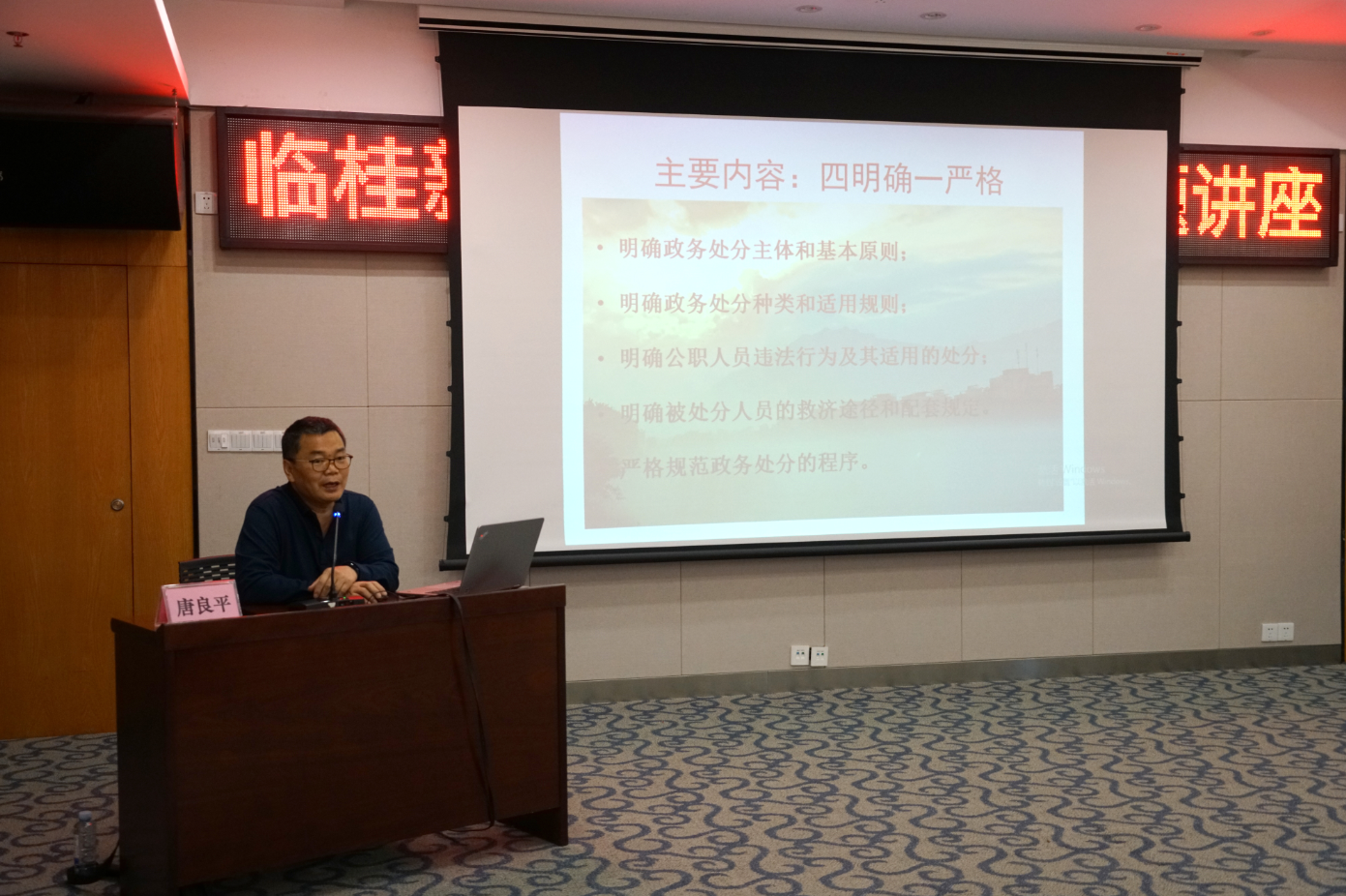 唐良平從《公職人員政務(wù)處分法》的背景和意義,以及政務(wù)處分的基本原則、適用對象、種類和程序等主要內(nèi)容進(jìn)行了全面深入的闡述,通過結(jié)合實(shí)際案例,對《公職人員政務(wù)處分法》的十大問題及法律條文進(jìn)行了重點(diǎn)解讀,提出學(xué)法用法關(guān)鍵在于實(shí)踐。