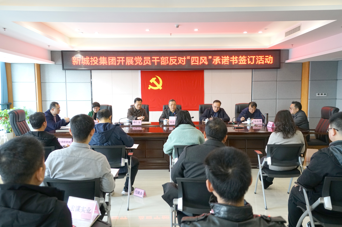 為進(jìn)一步深入貫徹習(xí)近平總書記關(guān)于進(jìn)一步糾治“四風(fēng)”、加強(qiáng)作風(fēng)建設(shè)的論述,深入開展黨員干部涉酒違紀(jì)違法問題專項(xiàng)整治工作,近日,新城投集團(tuán)組織公司班子成員,各部室、子公司負(fù)責(zé)人等黨員干部簽訂《黨員干部和公職人員反對(duì)“四風(fēng)”承諾書》,公開承諾帶頭自覺糾正“四風(fēng)”,持之以恒貫徹落實(shí)中央八項(xiàng)規(guī)定及其實(shí)施細(xì)則精神,主動(dòng)接受監(jiān)督。集團(tuán)黨總支書記、董事長(zhǎng)周道林主持會(huì)議。集團(tuán)領(lǐng)導(dǎo)班子成員,各部室、子公司負(fù)責(zé)人參加會(huì)議。