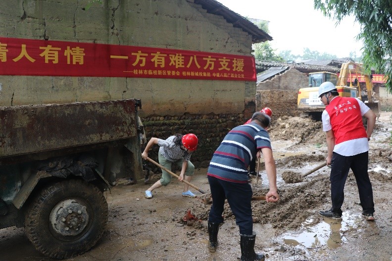 近期,臨桂新區(qū)鄉(xiāng)村振興聯(lián)系點(diǎn)五通鎮(zhèn)羅江村連續(xù)遭遇多輪強(qiáng)降雨侵襲,鄉(xiāng)村路面房屋受災(zāi)嚴(yán)重,村落存在大量積水和淤泥。面對(duì)災(zāi)情,臨桂新區(qū)黨工委委員、管委會(huì)常務(wù)副主任李星明,新區(qū)黨工委委員、管委會(huì)副主任、機(jī)關(guān)黨委書記蔣玖明了解情況后,急群眾所急、想群眾所想,立即把這項(xiàng)艱巨任務(wù)交給了新城投集團(tuán)黨總支,建議由會(huì)展中心項(xiàng)目部臨時(shí)聯(lián)合黨支部作為實(shí)施主體。新城投集團(tuán)黨總支副書記、總經(jīng)理黃峻按照部署立刻布置相關(guān)工作,安排集團(tuán)黨總支組織委員、工會(huì)主席、聯(lián)合黨支部副書記譚力源組織聯(lián)合黨支部成員單位——中建八局廣西公司桂林項(xiàng)目部具體緊急落實(shí),要求發(fā)揮央企技術(shù)優(yōu)勢(shì)和國(guó)企平臺(tái)資源,為鄉(xiāng)村災(zāi)后重建做好服務(wù)保障、力所能及的為村民解憂,以此提升“黨旗映勝地”黨建品牌的時(shí)代內(nèi)涵。
