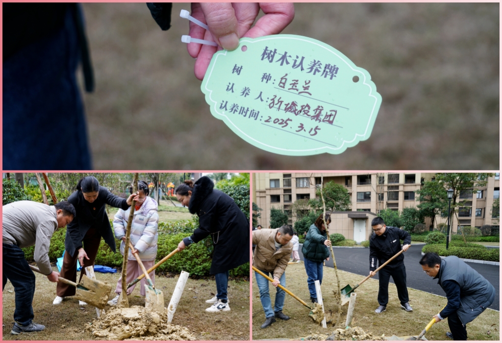 隨后,志愿者們?cè)谛^(qū)內(nèi)開(kāi)展了植樹活動(dòng)。他們揮鍬鏟土、扶樹正苗、澆水培土,和居民們一起在小區(qū)草坪處種下一排白玉蘭樹。經(jīng)過(guò)一番辛勤勞動(dòng),一棵棵新栽的白玉蘭樹苗在春風(fēng)中挺拔而立,為小區(qū)增添了一抹盎然的綠意。這些樹苗不僅美化了小區(qū)環(huán)境,也為居民們營(yíng)造了一個(gè)更加綠色、溫馨的居住條件。