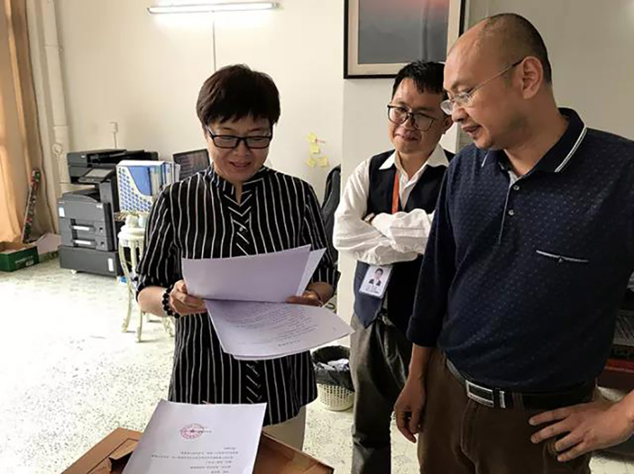 圖為張新悅副總裁在檢查宏謀物業(yè)公司安全生產(chǎn)資料
