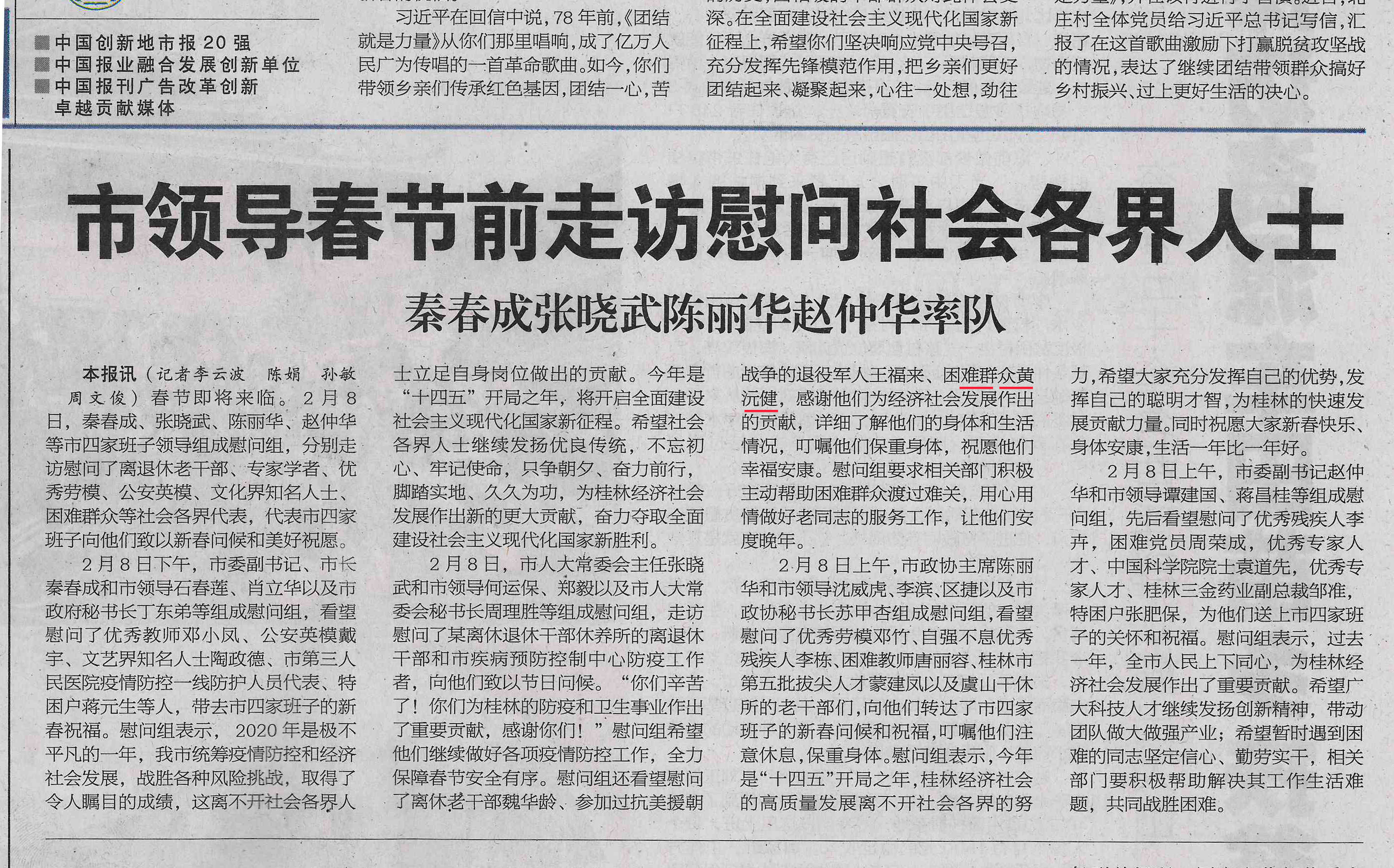 2月8日,市人大常委會主任張曉武和市領(lǐng)導(dǎo)何運(yùn)保、鄭毅以及市人大常委會秘書長周理勝等組成慰問組,走訪慰問了桂林新城投資集團(tuán)困難職工黃沅健。