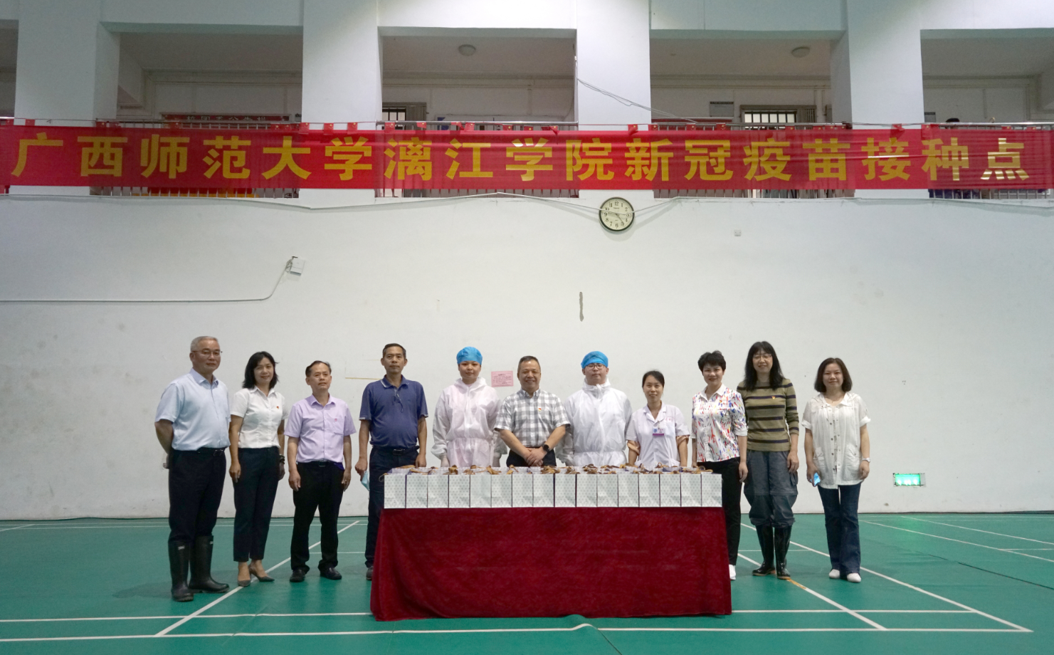 周道林一行在疫苗接種點查看接種情況、在留觀區(qū)詢問完成接種師生的觀察情況,并慰問了各服務(wù)點的醫(yī)護人員,代表新城投資集團和漓江學(xué)院送上護士節(jié)的慰問品和祝福。
