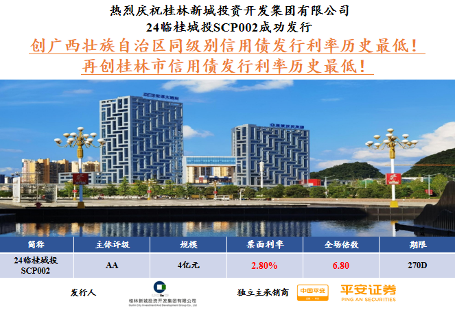2月2日,桂林城鄉(xiāng)建設(shè)控股集團(tuán)有限公司旗下桂林新城投資開發(fā)集團(tuán)有限公司成功發(fā)行2024年度第二期超短融,規(guī)模4億元,期限270天,票面利率2.80%,認(rèn)購倍數(shù)6.80倍,本期超短融由平安證券獨(dú)立承銷。此次成功發(fā)行超短融再創(chuàng)桂林市信用債發(fā)行利率歷史最低,也是廣西壯族自治區(qū)同級別超短融發(fā)行利率歷史最低!