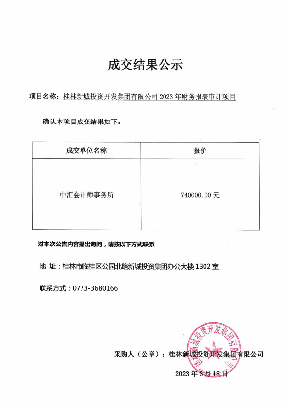 桂林新城投資開發(fā)集團(tuán)有限公司2023年財(cái)務(wù)報(bào)表審計(jì)項(xiàng)目成交結(jié)果公示