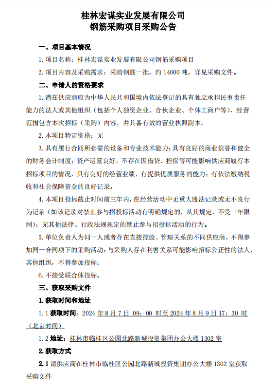 桂林宏謀實(shí)業(yè)發(fā)展有限公司鋼筋采購(gòu)項(xiàng)目采購(gòu)公告