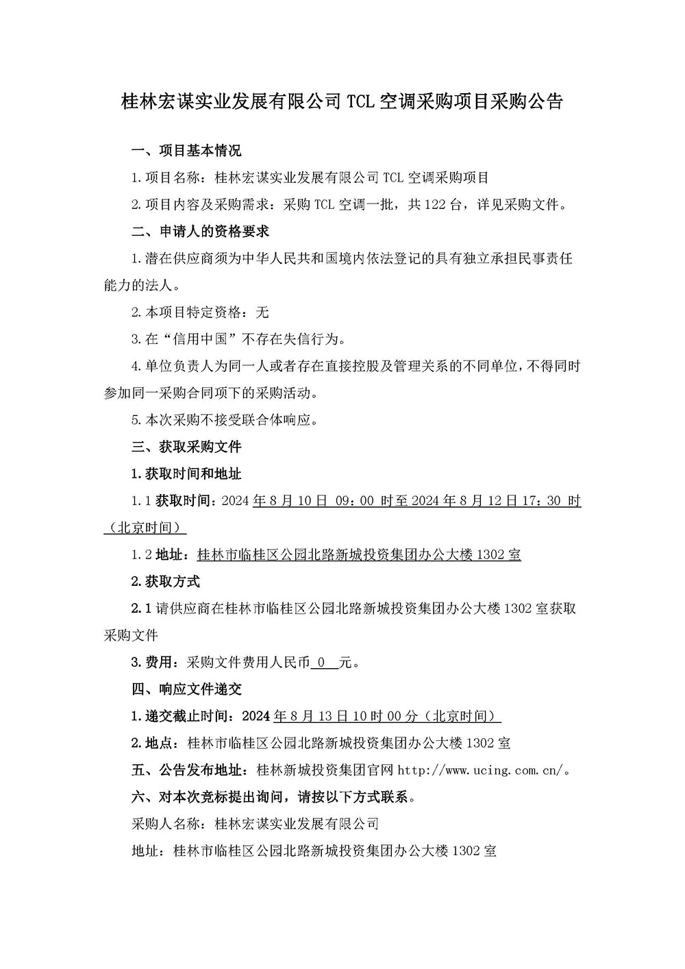 桂林宏謀實業(yè)發(fā)展有限公司TCL空調(diào)采購項目采購公告