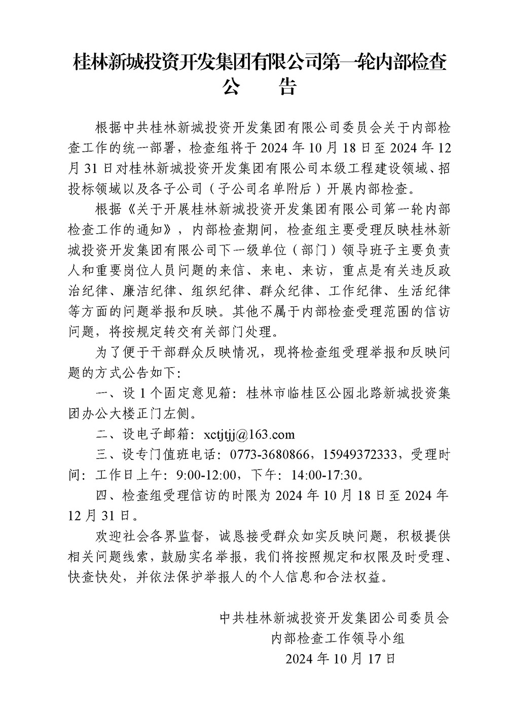 桂林新城投資開發(fā)集團有限公司第一輪內部檢查公告