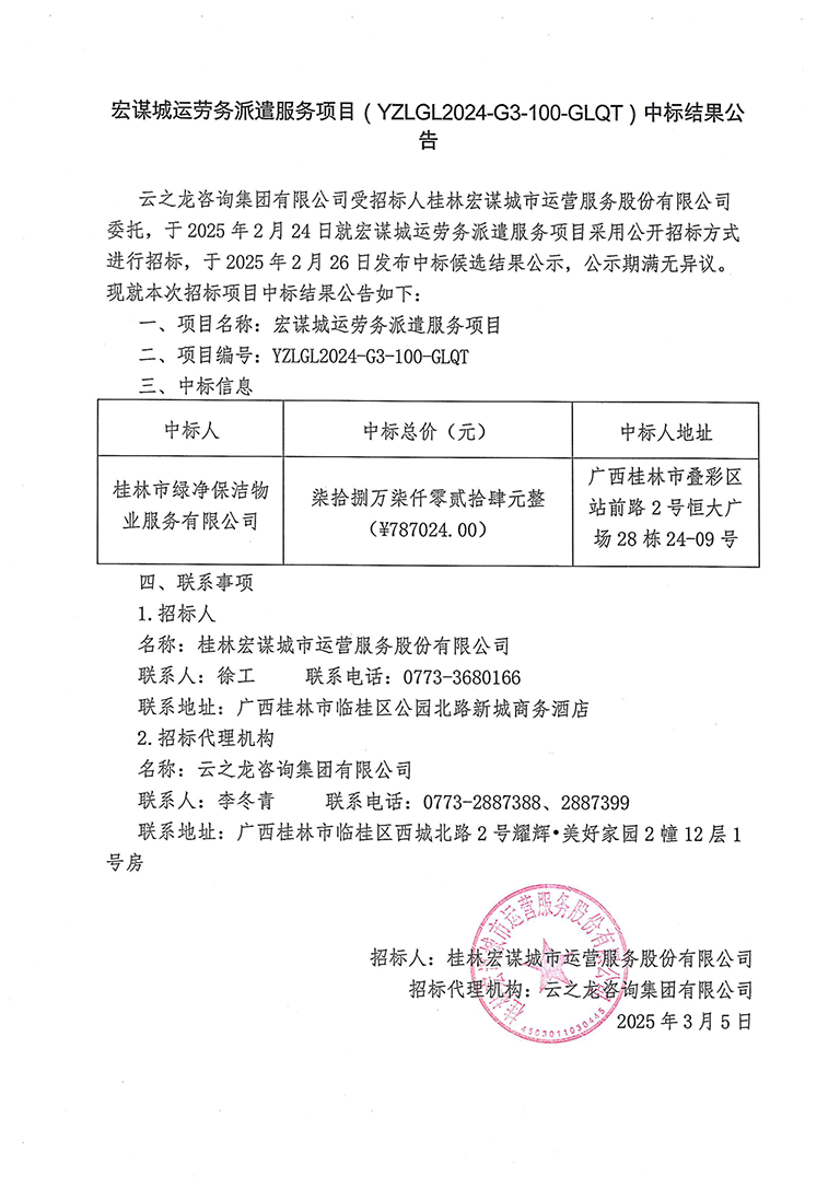 宏謀城運勞務(wù)派遣服務(wù)項目(YZLGL2024-G3-100-GLQT)中標(biāo)結(jié)果公告