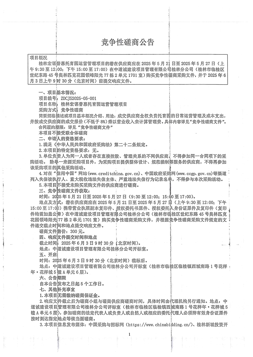 桂林宏謀普惠托育園運(yùn)營(yíng)管理項(xiàng)目競(jìng)爭(zhēng)性磋商公告