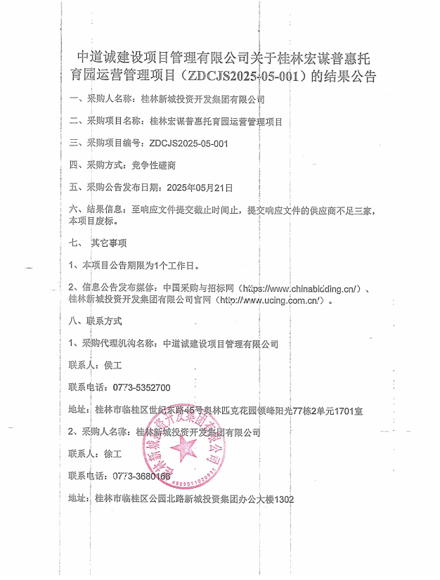 中道誠建設(shè)項(xiàng)目管理有限公司關(guān)于桂林宏謀普惠托育園運(yùn)營(yíng)管理項(xiàng)目(ZDCJS2025-05-001)的結(jié)果公告