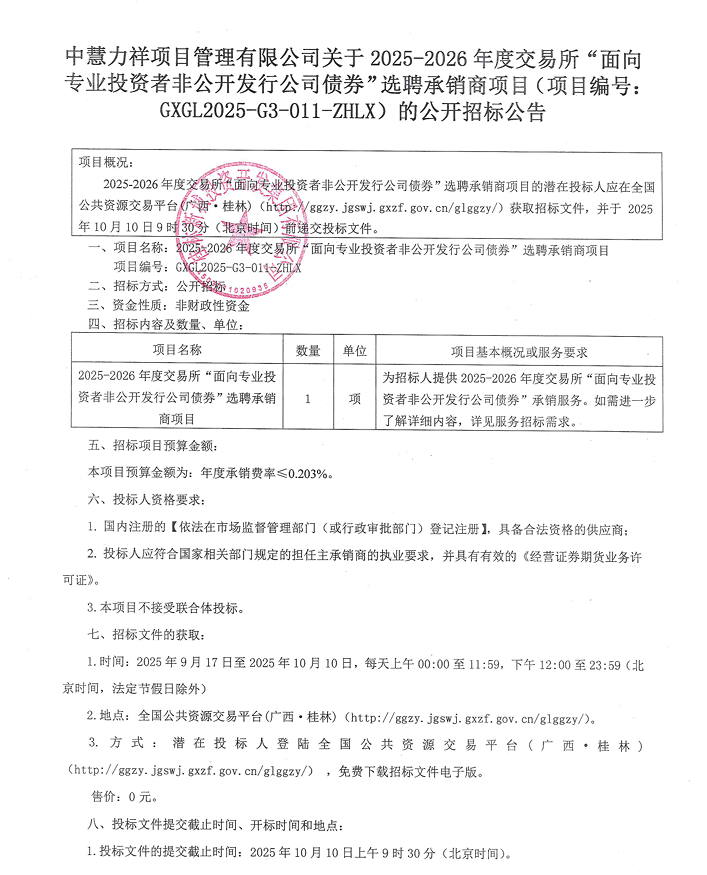 中慧力祥項(xiàng)目管理有限公司關(guān)于2025-2026年度交易所“面向?qū)I(yè)投資者非公開(kāi)發(fā)行公司債券”選聘承銷(xiāo)商項(xiàng)目(項(xiàng)目編號(hào):GXGL2025-G3-011-ZHLX)的公開(kāi)招標(biāo)公告