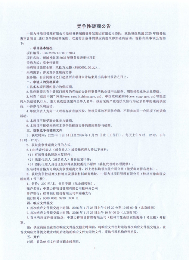 中慧力祥項(xiàng)目管理有限公司關(guān)于新城投集團(tuán)2025年財務(wù)報表審計項(xiàng)目競爭性磋商公告