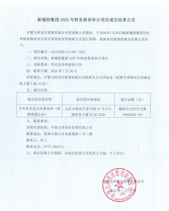 新城投集團(tuán)2025年財(cái)務(wù)報(bào)表審計(jì)項(xiàng)目成交結(jié)果公告